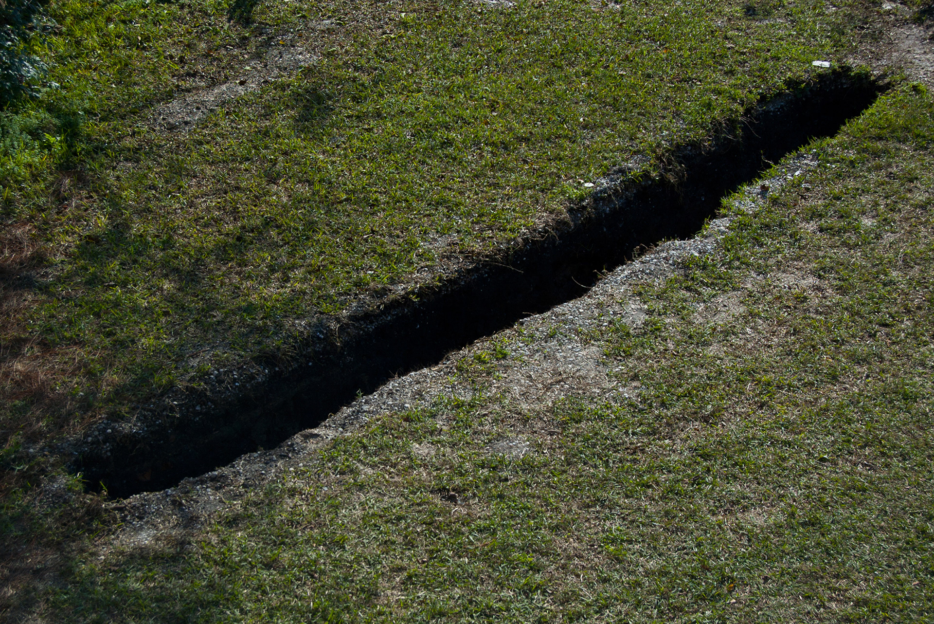 Rampart is a research based project on the typology of national borders and demarcation. The installation involved excavating two hundred and fifty cubic feet of earth and displacing it into the gallery to form a physical barrier. In relation to the shear volume of earth, hangs a series of half toned romantic images titled With Backs to the Wall that show locations of border disputes